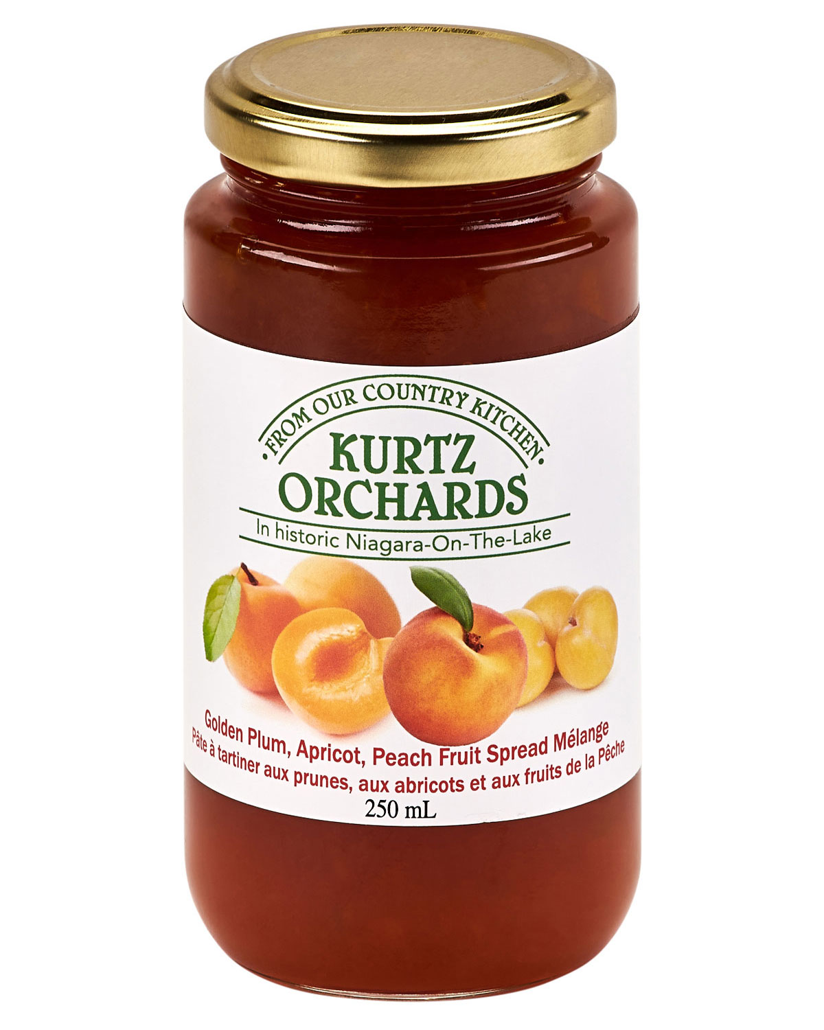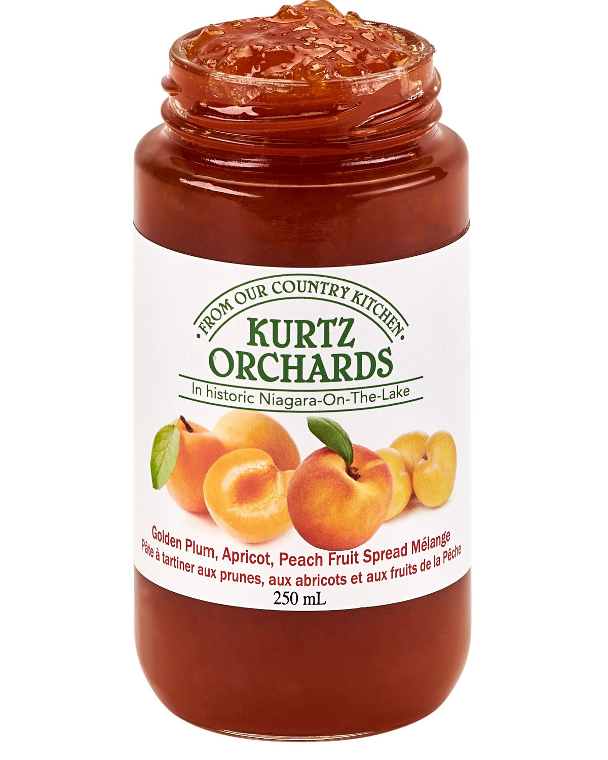 Golden Plum, Apricot, Peach Fruit Spread Melange: If you are looking for ‘all natural’- this product is for you! It’s fruit salad in a jar! Simply fresh fruit and a little sweetness simmered together to make this delightful combination of Niagara grown fruits so delicious and so spreadable. No pectin needed in this jar – the blend of fruits are perfectly balanced to bring you that homemade taste.