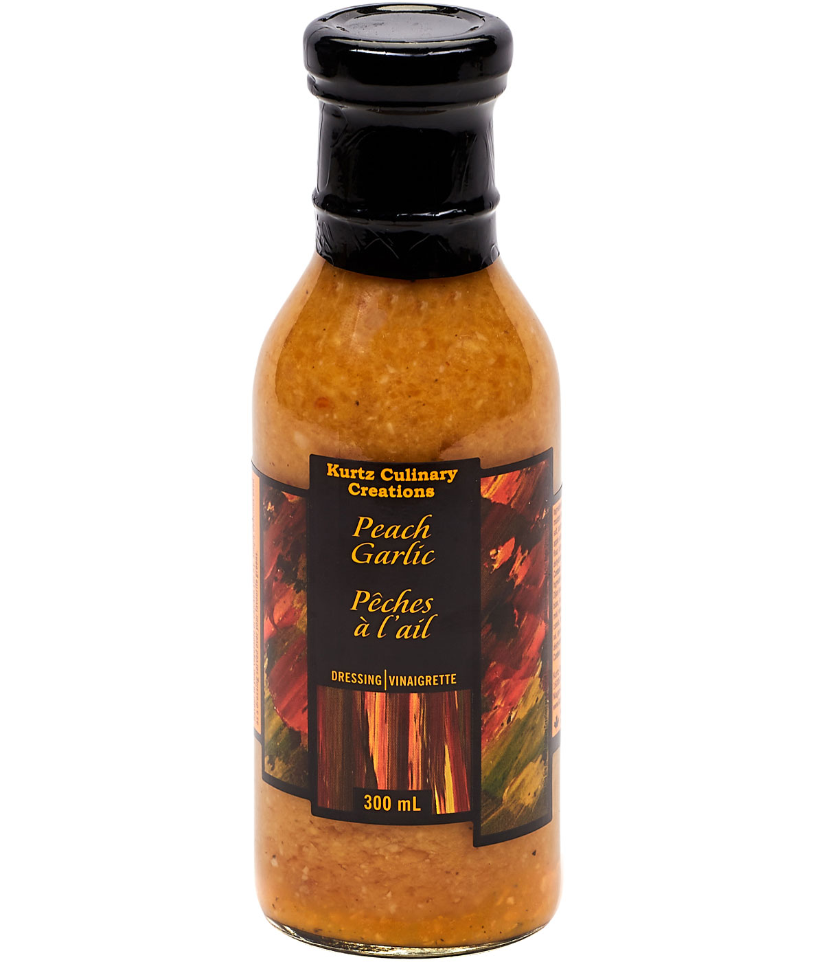 Peach Garlic Dressing: From farm to table, Niagara grown peaches simmered with plenty of garlic to create a great taste experience for you with this wonderfully versatile dressing and sauce.